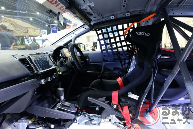 運転席以外のシートは撤去されているほか、リアスポイラーなどの外装パーツや、テイン製ショックアブソーバー、スパルコ製フルバケットシート、ADVANブランドのタイヤなどが装着され、本格的なレース仕様に仕上がっています。