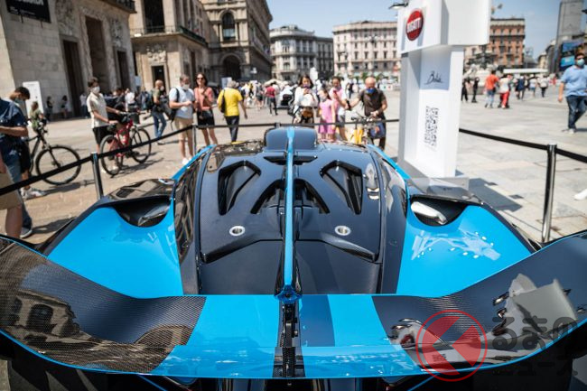 ボライドは、2020年秋にデビューを果たしながらも、これまではデジタルの世界だけであった。それが今回、ミラノのドゥオーモ前に展示され、リアルでの初お披露目となったのである。このサーキットに焦点を合わせたハイパースポーツカーは、最高出力1850ps、重量1240kg、パワーウェイトレシオは0.67kg/psを誇る驚異的なパフォーマンスを実現した。今までのクルマとはまったく違う異次元のクルマだ。