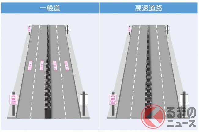 こうした標識に加え、2021年7月上旬の段階で都内の道路を見ると、すでにピンク色の実線や破線などが引かれており、いよいよ東京2020大会が目前迫ってきたというのが見て取れるでしょう。