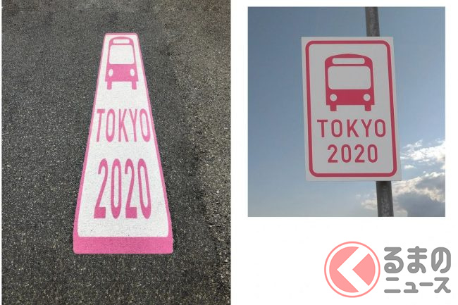 このほか、高速道路や一般道の各所に白地にピンク文字で「TOKYO2020」という文字とバスのイラストが書かれた標識が掲げられています。これは大会関係の車両が通る道路であるということを意味しています。