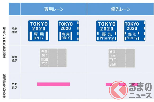 この通行帯では、「優先 Prioriy 7-9 TOKYO 2020」という規制標示が書かれ、同時に「TOKYO2020 優先 Priority」と記載された規制標識が設けられています。