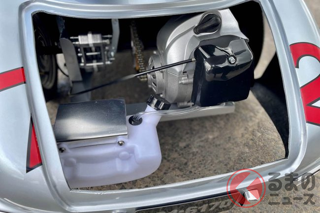 このチルドレンズ・カーは、もちろん実走可能なものである。リアに搭載される排気量48ccの単気筒エンジンに、遠心式のクラッチを組み合わせることで、最高速度は15mph(約24km/h)に達するという。