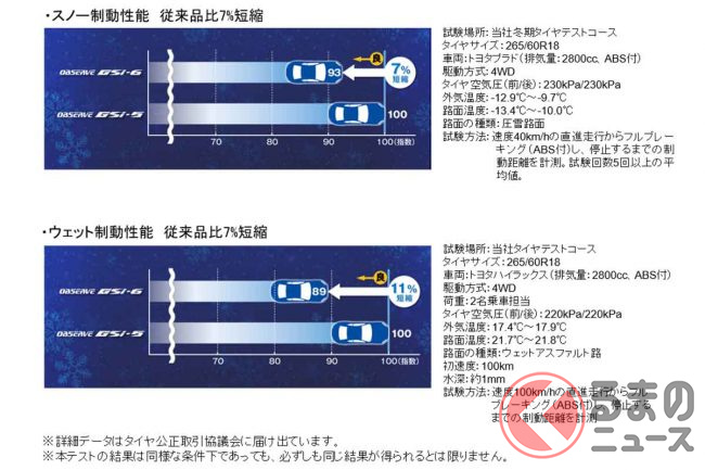 今回新たに登場した新SUV用タイヤ、オブザーブGSi−6は、さまざまな状況に変化する冬の路面でのハンドリング性能とブレーキング性能の向上を図っています。圧雪路においてのブレーキング性能は、従来品「オブザーブGSi−5」比で7%向上。さらにウエット路面では制動距離を11%短縮しています。