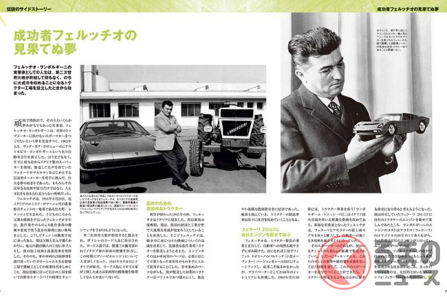 トラクター製造で成功者となったフェルッチオ・ランボルギーニが挑んだ究極のスポーツカー製作の道程や、ヒストリカルな名車なども多くの写真とともに紹介されるスポーツカーファン垂涎の内容となっている。