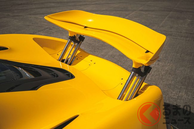 必要に応じてライズアップする(ドライバーが走行モードでレースを選択すれば、車高が50mm低下すると同時に、このウイングは300mm上昇。それ以外のモードでは、上昇幅は180mmに抑えられる)リアウイングはダブルエレメント=ダブルウイングである。