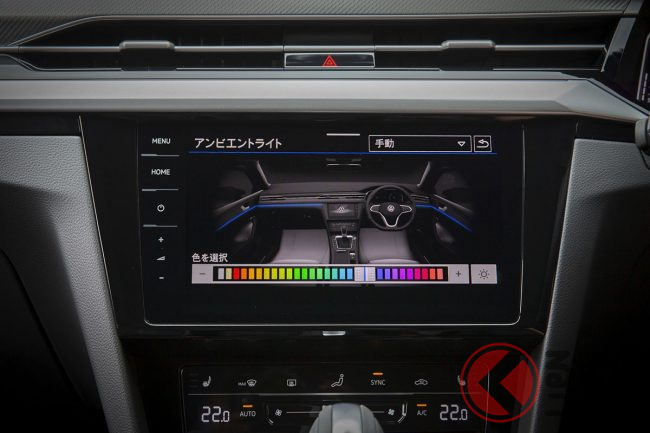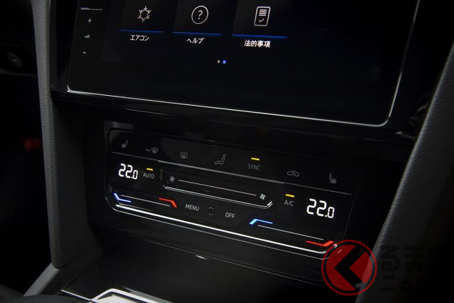インテリアは、より高級感が高まっている。ダッシュパネル最上部とドアトリムをレザレットでカバーし、ステッチ装飾も入れられている。ダッシュパネル2層目は、エレガンスグレードではウッド、R-Lineグレードはアルミパネルを採用。また、全車標準装備のアンビエンスライトは、最大30色のカラー選択が可能だ。エアコンのディスプレイはデジタル化されて、新しいデザインへと進化。シートヒーターやデフロスターなど、空調関係の設定は、センタコンソールのタッチパネルを利用して操作するようになっている。