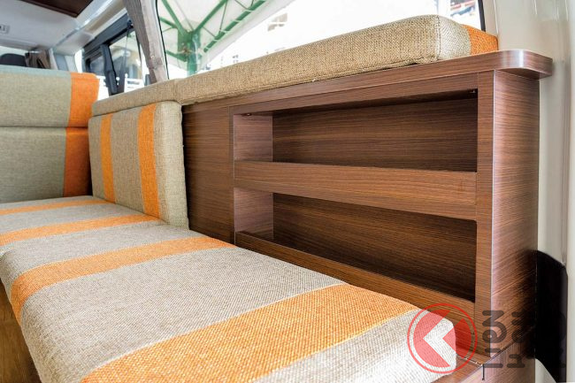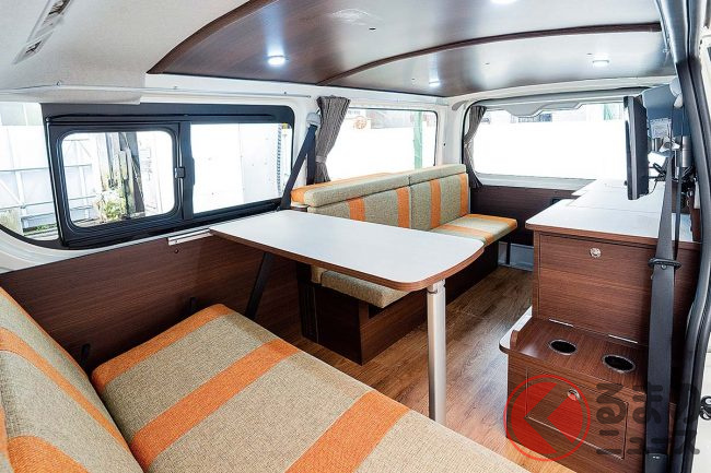 なお、専用家具やベッドマット以外の架装標準装備として、フロア施工や断熱処理、天井板張り(LEDライト4個)、テーブル・カップホルダー(4個)、US電源・シガーソケット、インバーター500W、遮光カーテン、115Ah サブバッテリー(2個)、バッテリーモニターなどが備わります。
