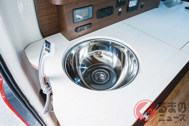 さらに、車両後部にはKT CRUISER専用の家具を設置。DC12V車載クーラーを設置することで車内の快適性を高めたり、左最後部に取り付けられたシンク&シャワーヘッドは、バックドアを開けて引き出せば、クルマの外でシャワーとして活用することもできます。
