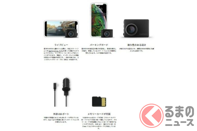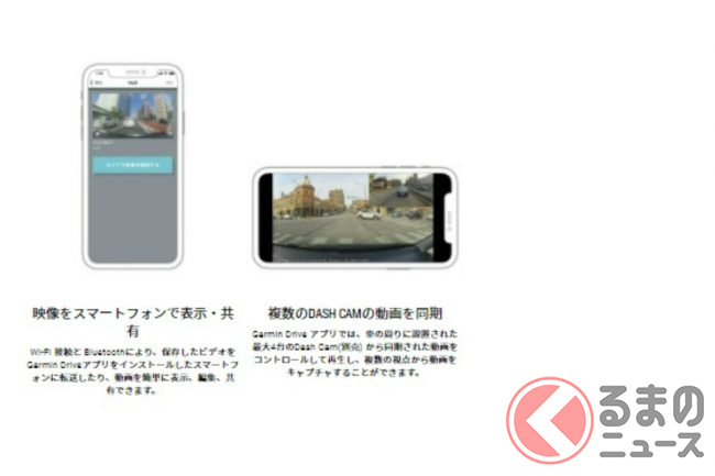 同シリーズは、走行中に前後方向を同時に記録でき、Wi-Fiを搭載しているため、撮影した精細な映像データをGarmin独自のアプリ「Garmin Drive」経由で、スマートフォンなどのデバイスに転送することが可能です。これにより不意の事故現場ですぐに映像を確認できるだけでなく、簡単に転送、編集などをおこなうことができます。