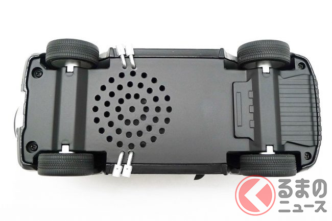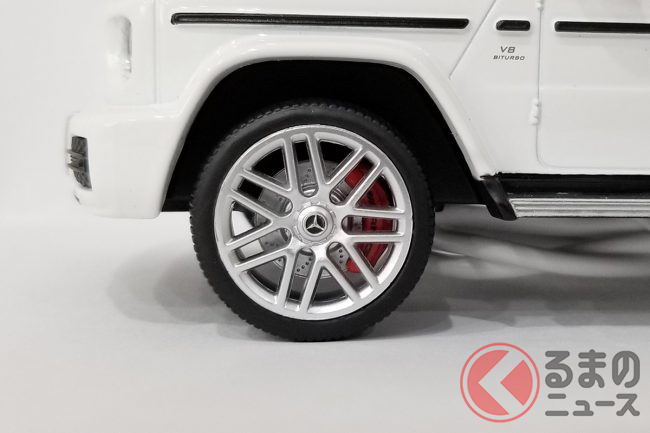 同Bluetoothスピーカーは実物に忠実なフォルムで、細かいディテールを完全再現。シルバーに輝くスペアタイヤカバーやAMGロゴ入りのブレーキキャリパーなど、精巧なミニチュアカーに見劣りしないほどのクオリティで、外見にこだわったスピーカーとなっている。音の出口は車体の裏面にあり、まさしくAMG G63のエキゾーストノートと同じように、車体の下部からサウンドが響き渡る仕組みだ。