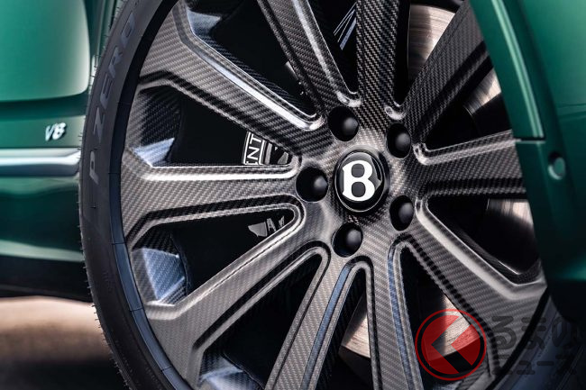 ベントレー初となるカーボンホイールは、有名なスペシャリストであるブッチコンポジット社との共同開発で誕生した。世界最大のカーボンホイールとなる予定で、アルミニウムと比較して、ホイール1本あたりのバネ下重量が6kg改善されるだけでなく、様々なメリットを持つという。
