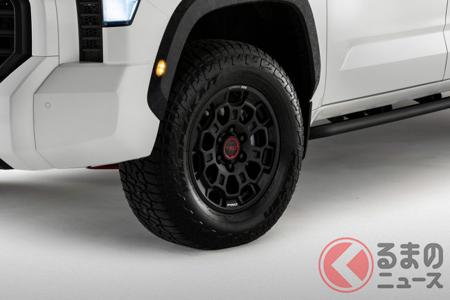 フェンダー上部に「TRD PRO」のロゴが配されたほか、「TRD」ロゴ入りの赤のセンターキャップが特徴的なブラックホイールで、精悍な雰囲気です。