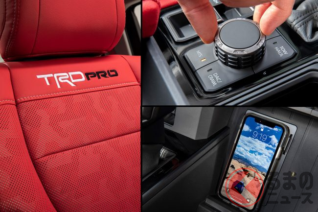 シート表皮には、外観にもあった「TRD PRO」が確認できるほか、前述の動画ではスマートフォンスタンドにスマートフォンのワイヤレス充電「Qi」規格のロゴが確認できます。