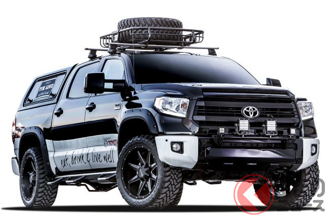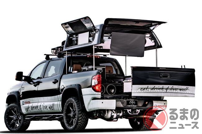 最強キャンプ車! 5m超トヨタ「タンドラ」のゴツ顔パリピ仕様にファン注目!? ビール飲んでプレステ可能?