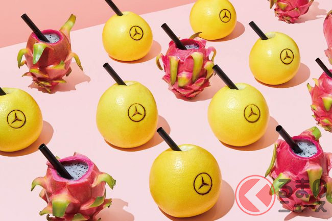 メルセデス・ベンツのエンブレムがプリントされた器が可愛い、グレープフルーツティー。まるごと絞ったグレープフルーツとアイスティーの組み合わせは酸味と甘みのバランスが絶妙。