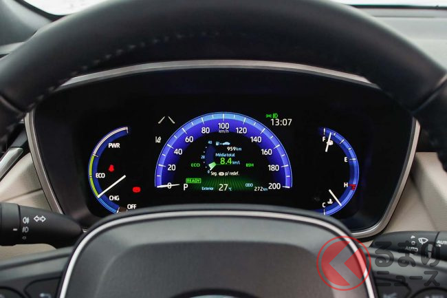 インパネは、ダッシュボードの中央に7インチのデジタルカラーTFTスクリーンを配置し、スピードメーターやトリップコンピューターの情報を表示。左側の半円部分にはハイブリッドシステムインジケーター、右側には燃料やエンジン温度の情報が表示されます。