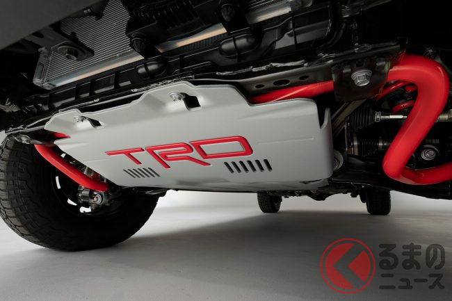 今回、8月10日に公開されたビジュアルは全3枚となり、オフロード走行では欠かせない赤い文字でTRDと書かれたアンダーカバー、赤いカラーが印象的な「TRD Pro」と書かれたFOX製サスペンション、さらにリアサスペンションがお披露目されました。