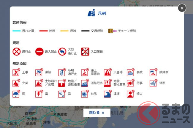 マップ上のアイコンをクリックすると、通行止めといった規制の状況や原因についての情報を得ることも可能です。