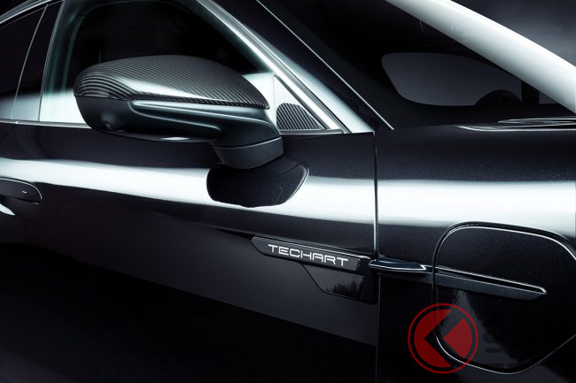 テックアート製タイカンのシルエットが、ノーマルのそれと大きく異なる豊かな表現力を見せるのは、カーボン製のサイドトリムやサイドミラートリム、ウインドウトライアングルの装着によるものである。