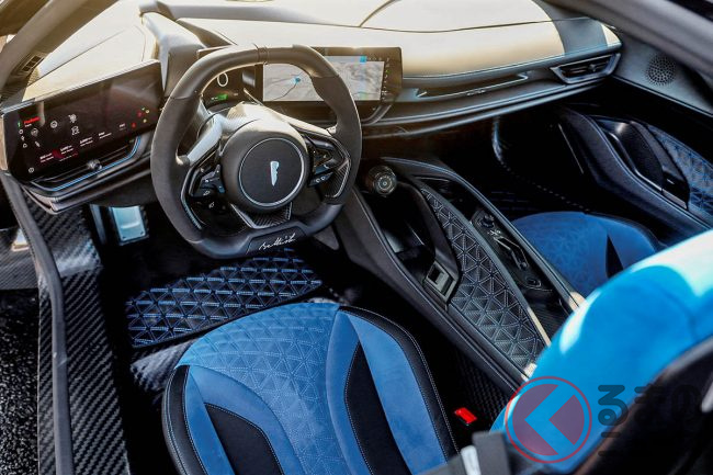 カーボンの繊維が露出したボディワークと、精密に磨かれた鍛造アルミニウム合金ホイールは、持続可能なブラックレザーで仕上げられたオプションのドライバーズシートとキルティングされた内装、コントラストステッチ、ブラッシュドアルミニウムで仕上げられた、インテリア・ジュエリーパックとも素晴らしいコントラストを見せている。