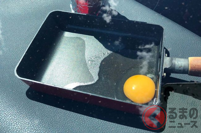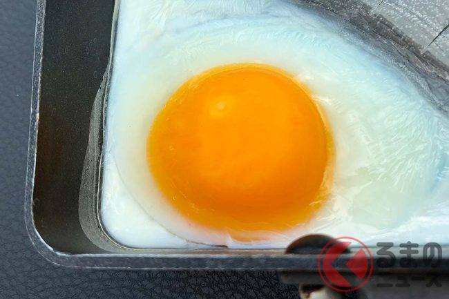 そして卵を割り入れたフライパンをダッシュボードで放置したところ、白身が固まり目玉焼き状態となりました。白身は60℃前後で固まり始めるといわれているので、相当な暑さになっていることがわかります。