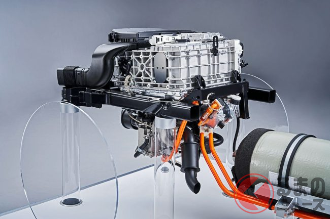 燃料電池システムは、水素と酸素の化学反応によって最大170馬力の電気エネルギーを発生。燃料電池の下にレイアウトされる電気コンバーターが、燃料電池の電圧を電位モーターの電圧レベルに調整し、駆動します。