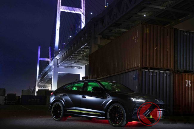 カラーとトリムに個性的で新しい表現の可能性が加えられたウルスGraphite Capsuleでは、夜色に包まれた東京で、新しいマットカラー「Nero Noctis(ブラック)」のボディに、アクセントカラー「Verde Scandal(グリーン)」が際立つシャープなツートンカラーの車体を撮影。