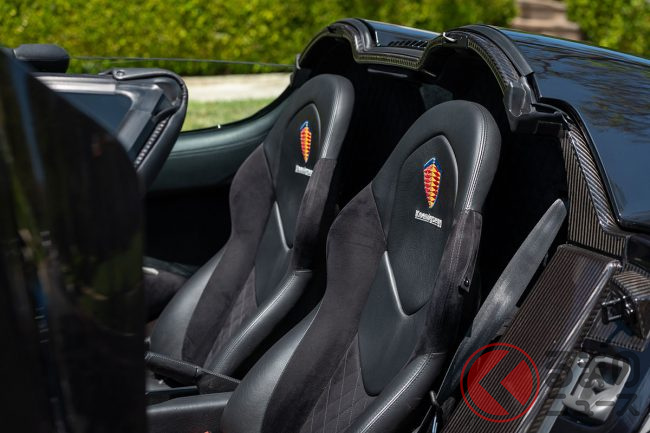 インテリアはブラックレザーとアルカンターラのコンビネーションでコンディションも良く、すべてのCCXと同様にボディパネルはもちろん、ホイール、シートフレーム、ダッシュボードインサート、ステアリングホイールなどはすべて軽量なカーボンファイバーで成型されている。