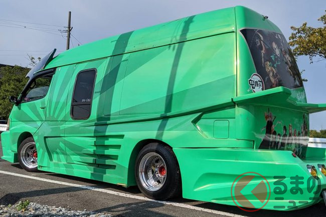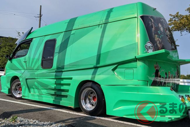 バニングには、芸能人やアニメのラッピングやイラストの施行をしている人も多く、@クマ@さんの場合では、グリーンのボディに、いま大人気の「鬼滅の刃」のイラストがリアウィンドウ部分に大きくデザインされています。