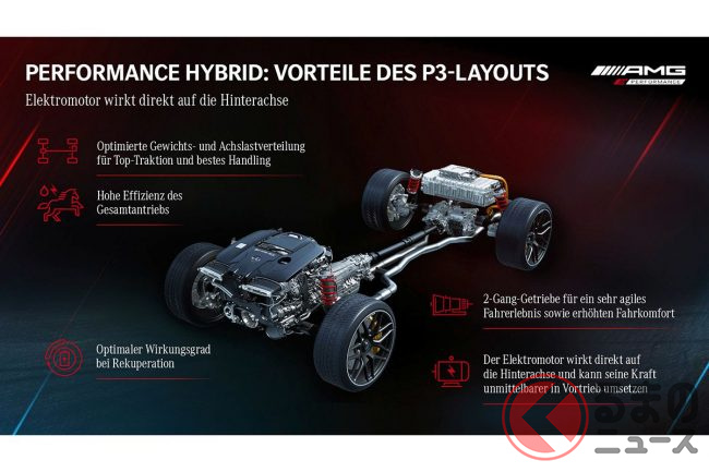基本的には、メルセデスAMGペトロナスのF1レーシングカーのハイブリッド・パワーパックの考え方を元にしています。ドライバーが必要とするときには、最大の推進力がいつでも利用可能で、たとえばコーナー出口での加速や追い越しの際には、高い回生性能とオンデマンド充電により、電気によるエネルギーをいつでも使うことが可能です。