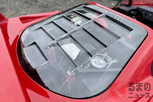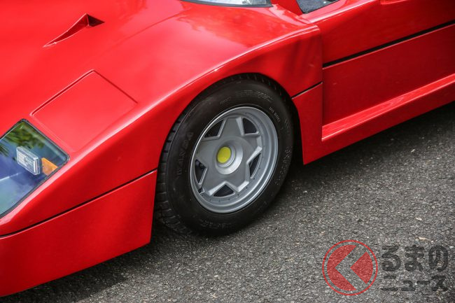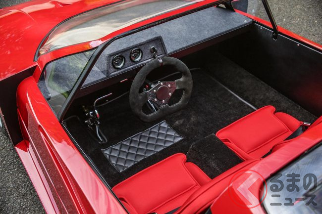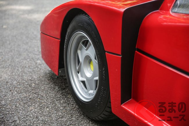 ボディはFRP製で、フェラーリ「308/328GTS」のようなデタッチャブル(脱着式)トップを外したかにも見えるスタイリング。本物のF40と同じく、レキサン樹脂製のスリット入りリアウインドー+チルト式リアカウルなどもF40っぽい。さらに前後のホイールも、本物のF40のO.Z.社製3ピースアロイを、当時としては可能な限り再現しようとしたことがうかがえる。
