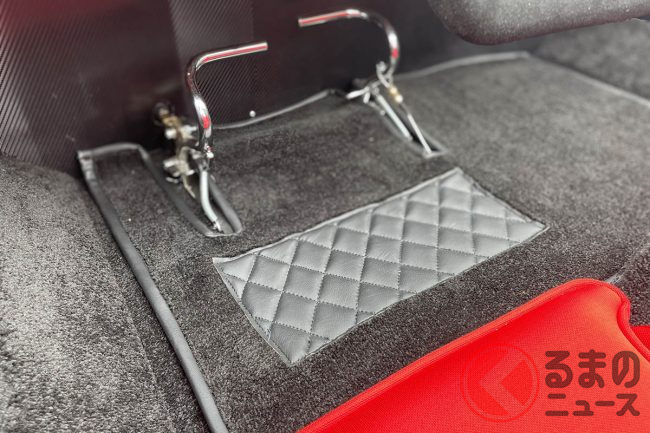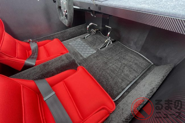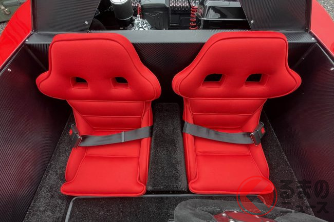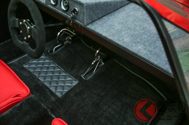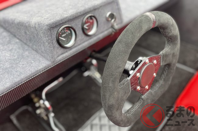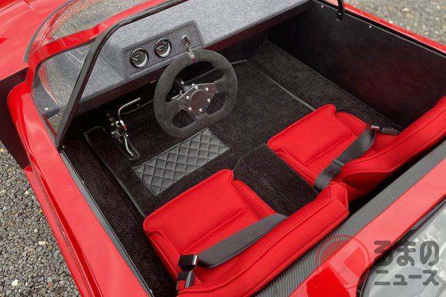 一方、オープンゆえに外から見えるインテリアもかなり作り込まれたもので、2座のミニバケットシートは、本物のF40に採用されたOMP社製バケットシートにも似た高品質の不燃性ファブリックで張り込まれる。また、ダッシュパネルにもザックリとした質感とダークグレーのカラーがホンモノを彷彿とさせるファブリックが張られ、実際に機能するメーターやイグニッションキーが取り付けられている。