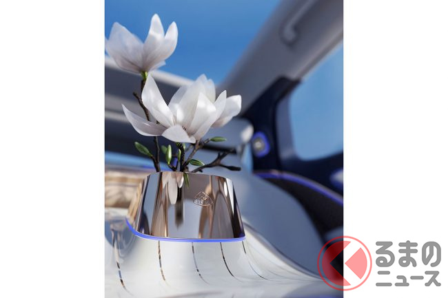 新型メルセデス・マイバッハ コンセプトEQSの内装は、左右独立した後席を備える4人乗り仕様。内装には花瓶が標準装備され、季節に応じた花を挿すことで車内に彩りを与えることができます。