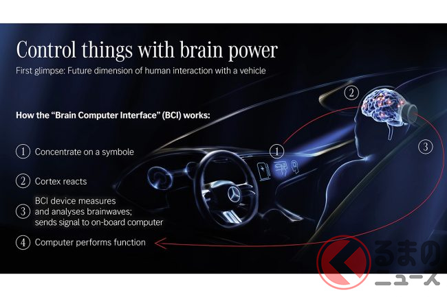 ヴィジョンAVTRに搭載される技術で最大のトピックとなるのは、ブレインコンピューターインターフェイス(BCI)だ。これは短いキャリブレーションプロセスの後、ドライバーの頭に取り付けられたBCIデバイスが測定された脳波を分析し、あらかじめ定義された機能をトリガーするという。