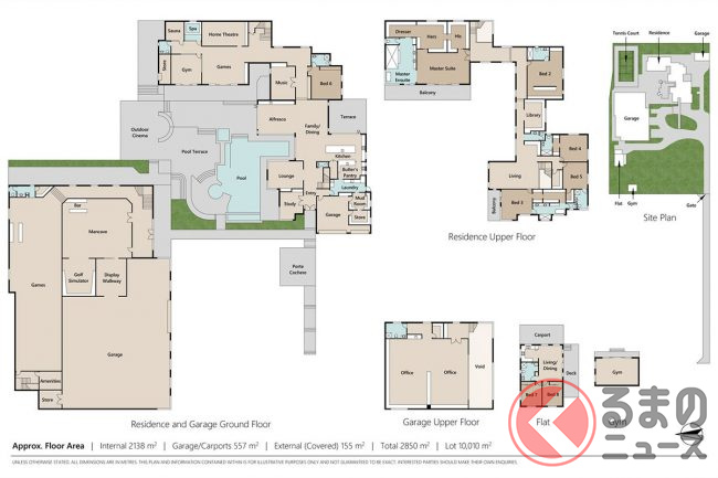 8ベッドルームと8バスルームを備え、プール、テニスコート、ジム、ワインセラー、シアタールームなども完備。建屋面積は2850平米にもおよぶ。2LDKの離れ(見取り図には「Flat」と記載されている)は、住み込みの家政婦/家政夫もしくはガードマン用であろう。