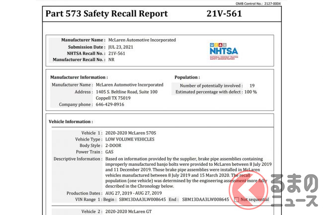 なお、アメリカのマクラーレン・オーナー19名からブレーキの不具合の報告は上がっていなかった。もっとも古いもので2019年7月8日生産、納車されたのが翌月と仮定すると、約2年も気づかなかったことになる。