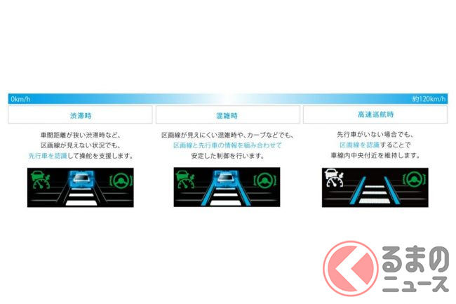 具体的には、高速道路の渋滞時(時速50km以下)におけるハンズオフ(ステアリングホイールから手を離すこと)アシスト、高速道路を時速70km以上で走行中、ドライバーが方向指示機を操作した時にも操舵支援を行うアクティブレーンチェンジアシスト、カーブや料金所の手前における減速制御などがあります。