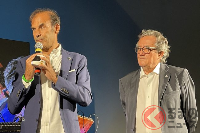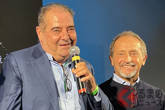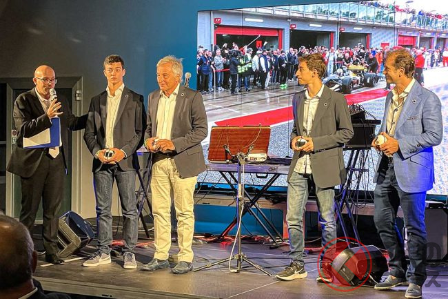 壇上には、ジャンカルロ・ミナルディを筆頭にアレッサンドロ・ナンニーニ、ピエル・ルイジ・マルティーニ、アレッサンドロ・カッフィ、ニコラ・ラリーニ、エマヌエレ・ピロ、ジャンニ・ジューディチ、最高年齢86歳のカルロ・ファチェッティ。そしてリッカルド・パトレーゼは現在F4で大活躍している15歳の息子ロレンツォと、ヤーノ・トゥルッリはF4、フォーミュラ ヨーロッパで大活躍をしている15歳の息子エンツォと共に壇上に上がった。