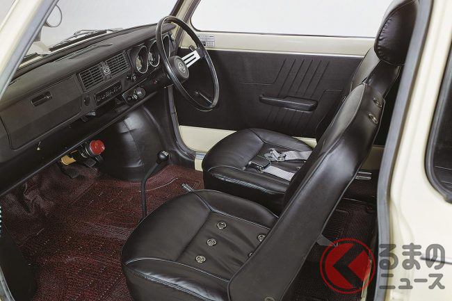 ボディは3ドアハッチバッククーペで、フロントフェイスはN360の後期型「NIII」をベースに、よりモダンに仕立てた印象です。外観で特徴的だったのがリアハッチで、その見た目から「水中メガネ」の愛称で呼ばれました。
