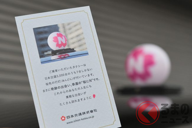 ピンク色の「桜にN」マークの行灯を上部に取り付けたタクシーとなり、都内を走る約5000台のうちわずか7台と極めて少ない、見つけられれば幸運なタクシーを運行しています。