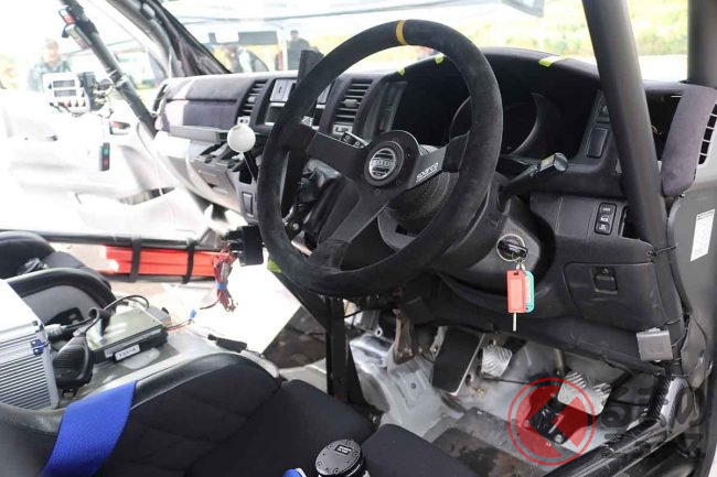 車高を下げて重心を低くしたセッティングで走る舗装路のラリーですら「コケるんじゃないの?」といわれるハイエースながら、今回砂利道を走るため車高を上げている。加えて平坦な舗装路と違い、砂利道は深いわだちがあるなど、リスク大きそう。