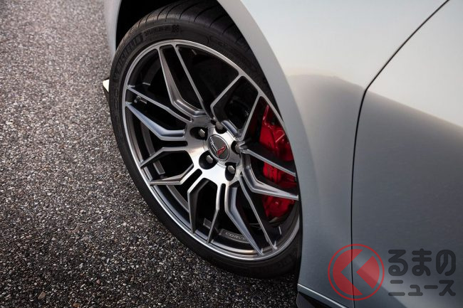 あり余るパワーを路面へと伝えるタイヤは、前275/30ZR20、後345/25R21という大径・幅広のミシュラン・パイロットスポーツ4S ZPタイヤを標準で装備。コルベット・スティングレイよりもフロントで30mm、リアで40mm広いトレッドとなるため、フロントとリアのフェンダーを引き出しています。