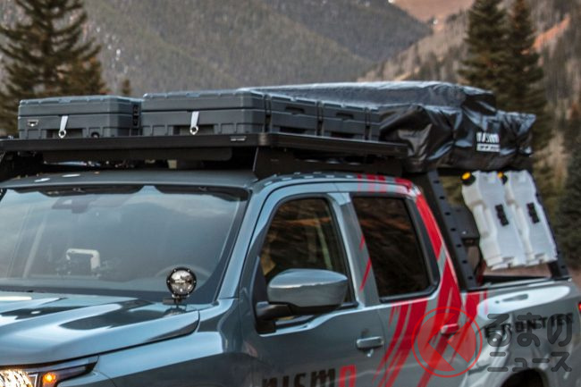 NISMOオフロード・オーバーランディング・ベッドラック、NISMOオフロード・ルーフトップテントといった装備も装着され、オーバーランド(キャンプやテント泊・車中泊をしながら長距離旅をおこなうスタイル)にも対応したカスタムモデルとなっています。