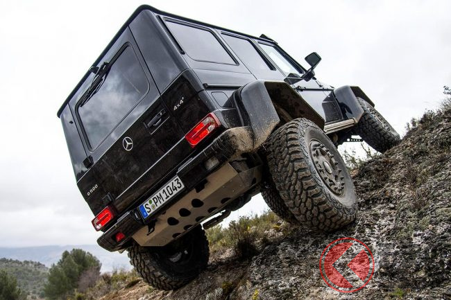 G550 4×4スクエアードはG550をベースに、「ウニモグ」などと同様の「ポータルアクスル」を採用。ポータルアクスルはホイールハブ内にギヤを内蔵し、車軸位置を変えずに最低地上高を高くできるもので、G550 4×4スクエアードでは最低地上高が460mm、渡河深度1000mmにも及びます。