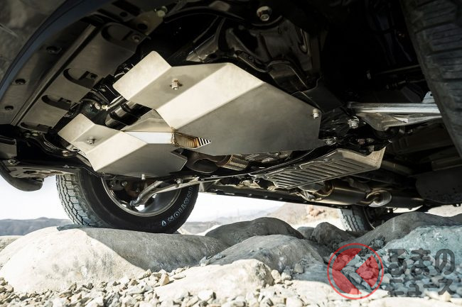 純正アクセサリーとして、ルーフクロスバーやフェンダーフレアや特別設計のスキッドプレート、リカバリーポイント(けん引フック)を搭載。