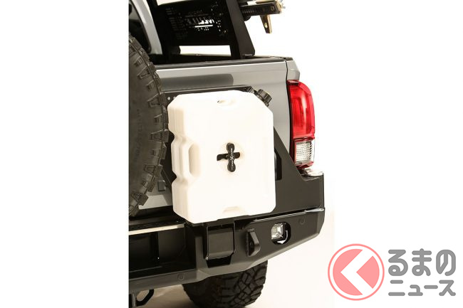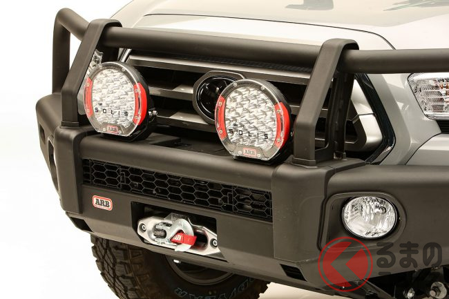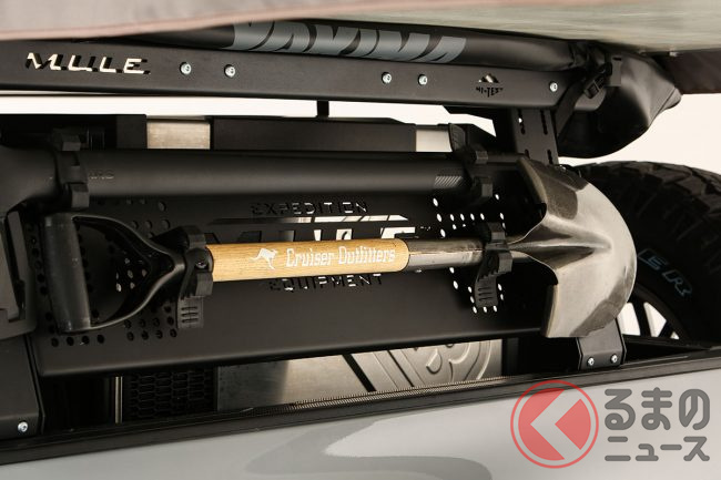 カスタム内容は、フロントの丸形ライトやLEDルーフラックライトバーなどライト類が追加されたほか、ウインチ、リカバリーキット、ハイリフトジャッキ、シャベル、斧などを追加し、過酷なオフロード走行にも対応。ブルバーも装備され、フロントフェイスも迫力あるデザインになっています。