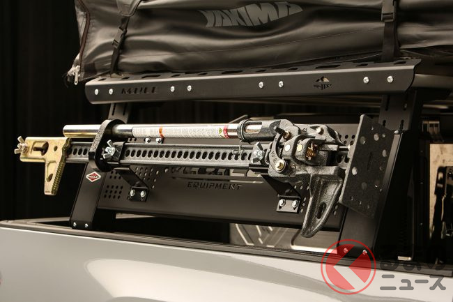 荷台部分にはベッドラックが組まれるほか、冷蔵庫や冷凍庫などを搭載。さらにYAKIMAのルーフトップテントを装備します。