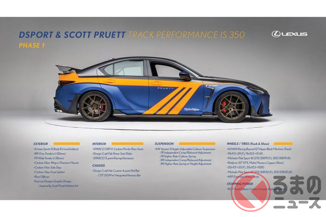 トラックパフォーマンスIS350は、FRスポーツセダンの「IS350」をベースに、レクサスのアンバサダーを務めるスコット・プルーエット氏ならびにDSPORT Magazineとのコラボレーションで開発。