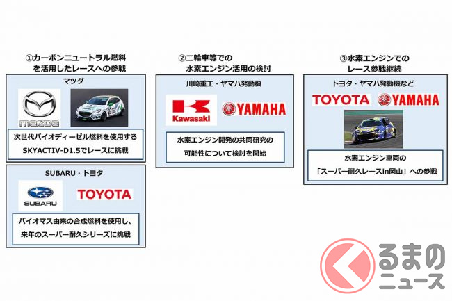 川崎重工業、スバル、トヨタ、マツダ、ヤマハ発動機の5社は2021年11月13日、カーボンニュートラル(CN)の実現に向けて、CN燃料を使用したレースへの参戦や、二輪車での水素エンジン開発といった取り組みを始めると発表しました。