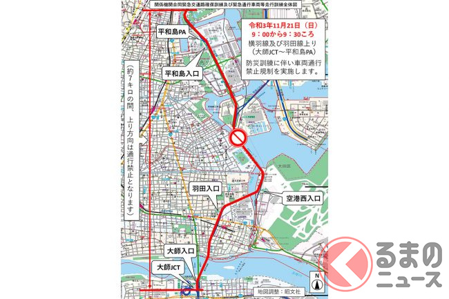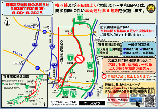 このほか、「関係機関合同緊急交通路確保訓練及び緊急通行車両等走行訓練」では、高速神奈川1号横羽線及び高速1号羽田線(大師ジャンクションから平和島パーキングエリア)区間において車両の通行が禁止されます。